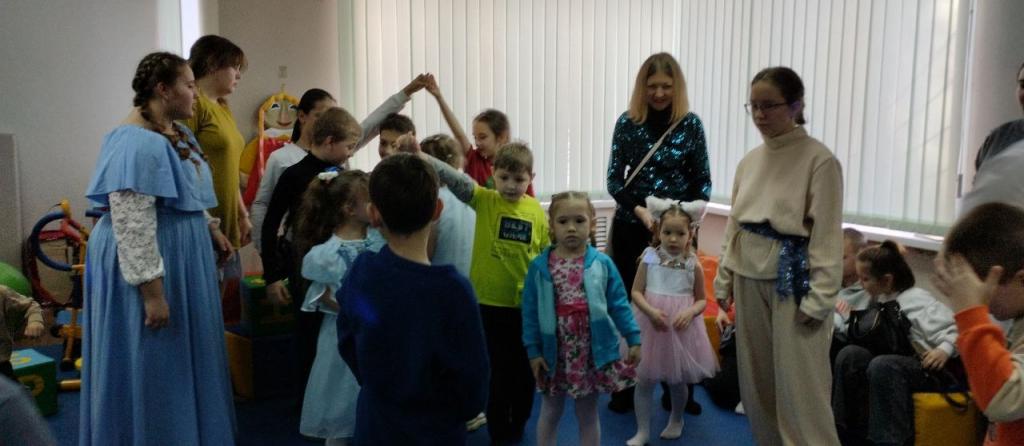 В гости к детям и родителям пришли гости в образах Ангела, Зайчика и Деда Мороза. Вместе они создавали праздничную атмосферу. Участники пели колядки, водили народные хороводы — "ручейки", вспоминая традиции славления Рождества.